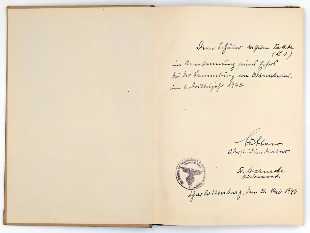 Handschriftliche Widmung auf dem Vorsatz für einen Schüler. Geschrieben und signiert vom Oberschuldirektor, Stempel der Schule in Berlin Charlottenburg, datiert 1943