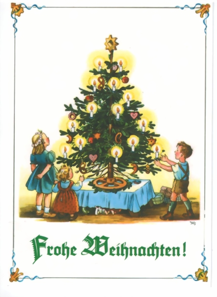 Farbige Grußkarte mit nostalgischem Weihnachtsmotiv.