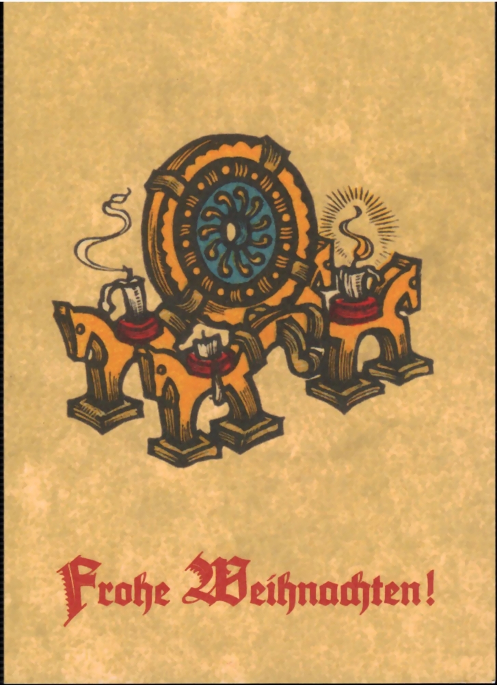 Farbige Grußkarte mit nostalgischem Weihnachtsmotiv.