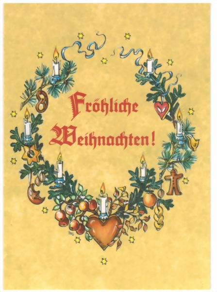 Farbige Grußkarte mit nostalgischem Weihnachtsmotiv.
