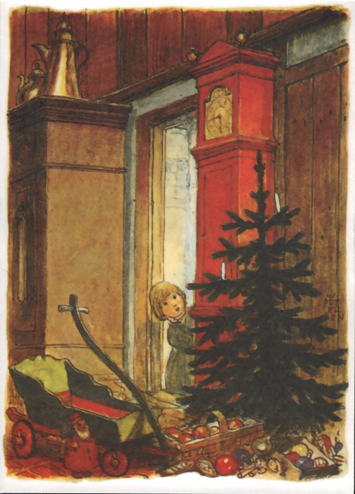 Farbige Grußkarte mit nostalgischem Weihnachtsmotiv.