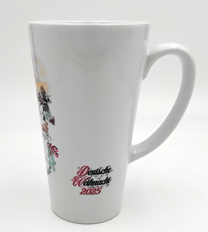 Keramiktasse "Gesegnete Weihnacht" mit nostalgischer Winterlandschaft und schwarz-weiß-roten Schleifen (Reichsflagge).