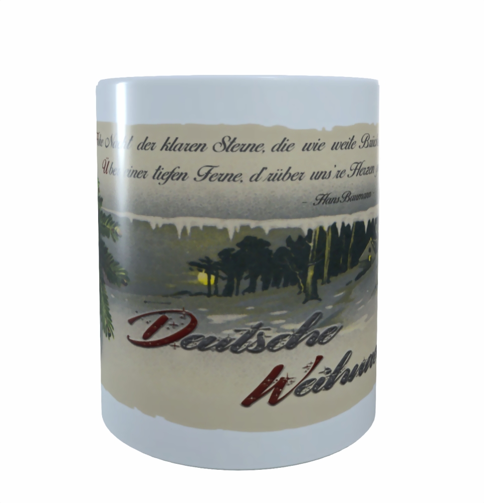 Keramiktasse mit weihnachtlichem Motiv aus der Kaiserzeit, schwarz-weiß-roten Schleifen (Reichsflagge) und Zeilen von Hans Baumann: "Hohe Nacht der klaren Sterne..." - Deutsche Weihnacht".