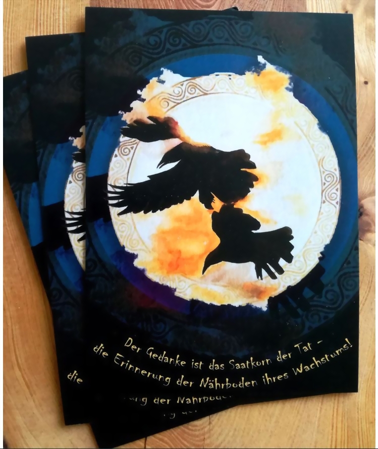 Gedanke und Erinnerung, dies sind die Namen der beiden treuen Raben Odins, die ihm von der Welt und ihren Geheimnissen berichten. Das Postkartenmotiv erzählt von ihnen und ist auch gerahmt ein Blickfang.