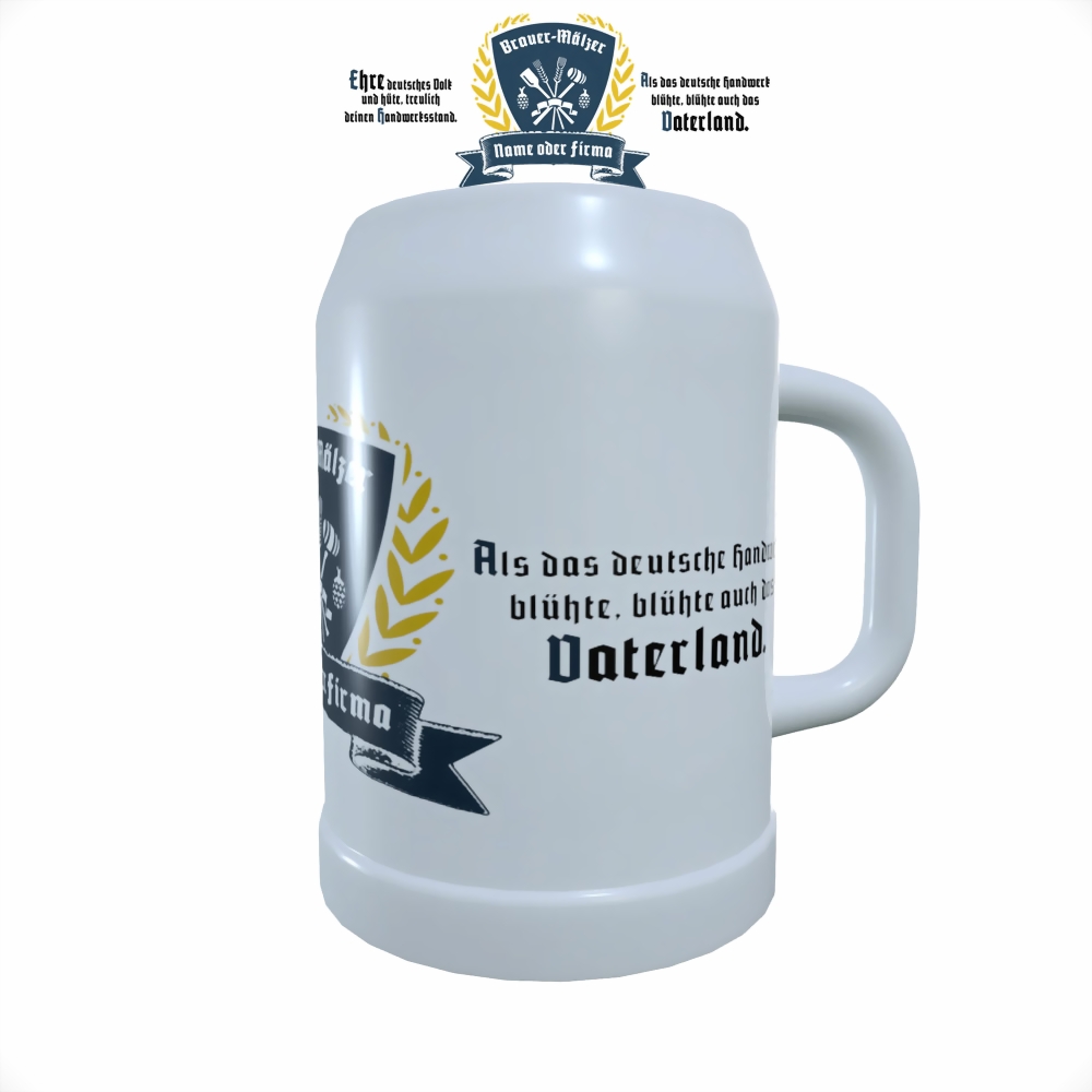 Keramik-Bierkrug in weiss, bedruckt