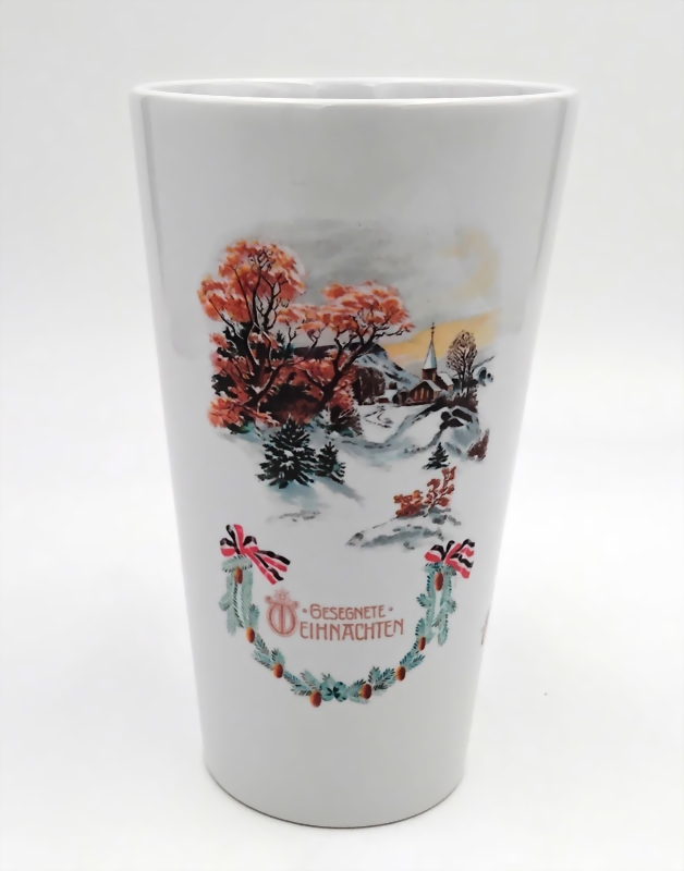 Keramiktasse "Gesegnete Weihnacht" mit nostalgischer Winterlandschaft und schwarz-weiß-roten Schleifen (Reichsflagge).