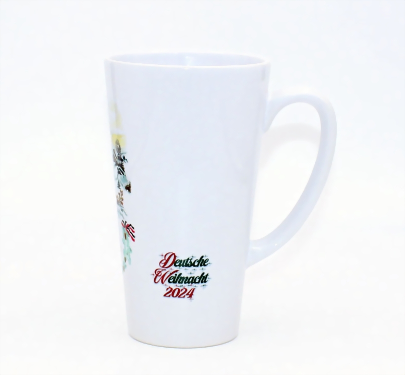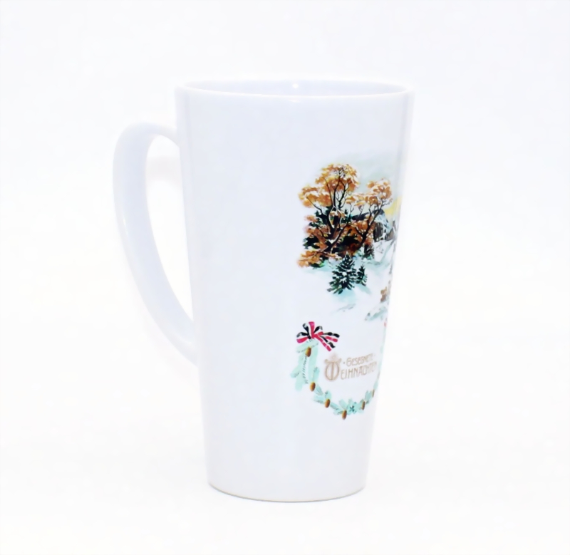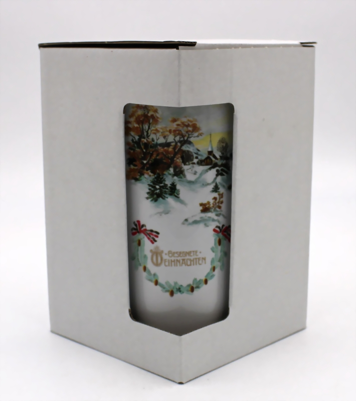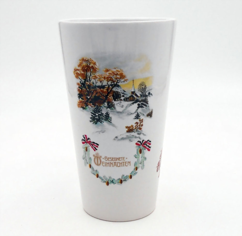 Keramiktasse "Gesegnete Weihnacht" mit nostalgischer Winterlandschaft und schwarz-weiß-roten Schleifen (Reichsflagge).