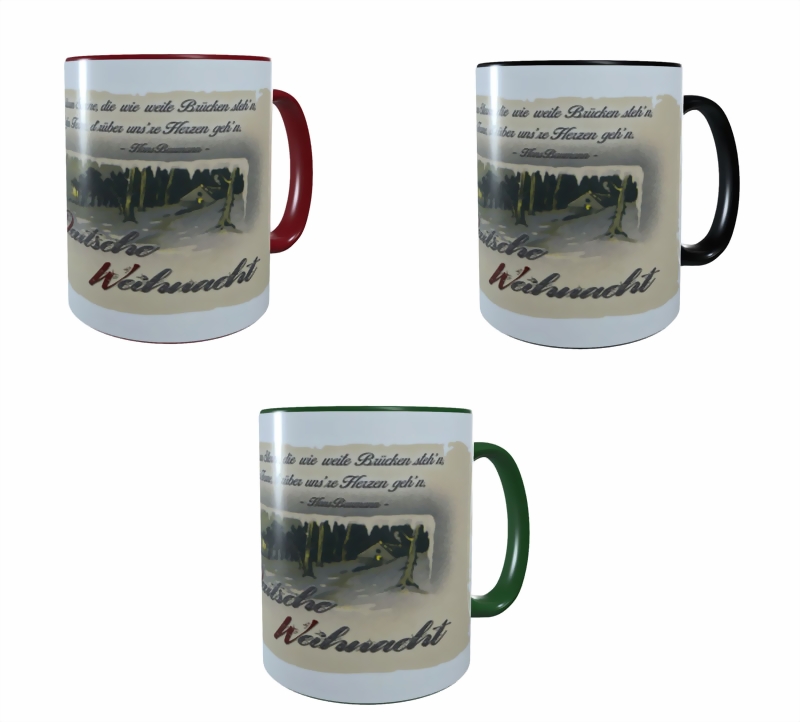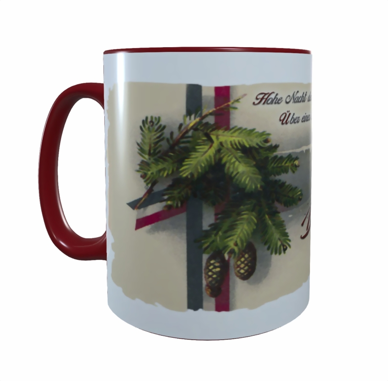 Keramiktasse mit weihnachtlichem Motiv aus der Kaiserzeit, schwarz-weiß-roten Schleifen (Reichsflagge) und Zeilen von Hans Baumann: "Hohe Nacht der klaren Sterne..." - Deutsche Weihnacht".