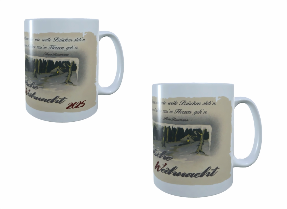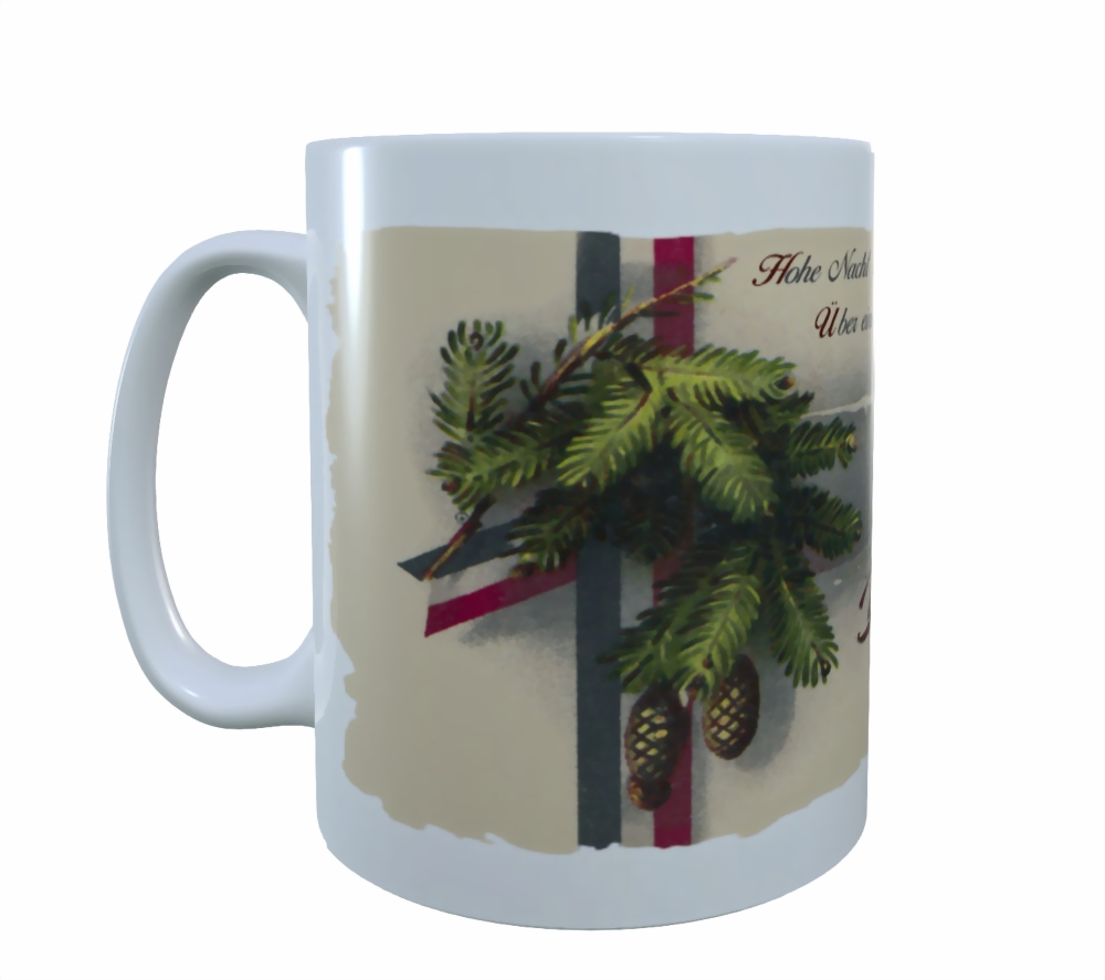 Keramiktasse mit weihnachtlichem Motiv aus der Kaiserzeit, schwarz-weiß-roten Schleifen (Reichsflagge) und Zeilen von Hans Baumann: "Hohe Nacht der klaren Sterne..." - Deutsche Weihnacht".